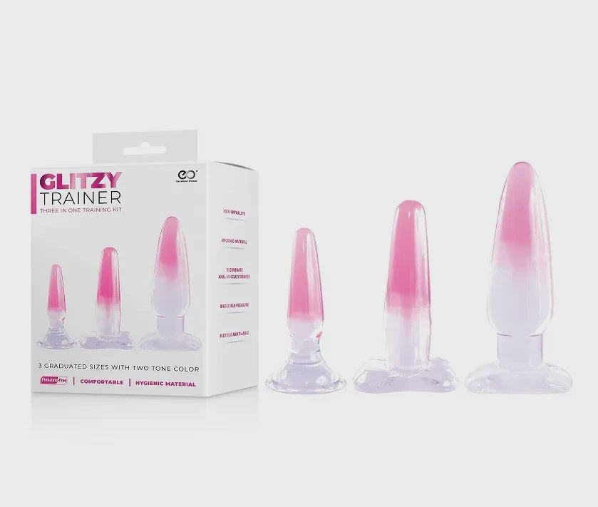 The Glitzy Trainers Three-in-One Training Kit is designed to support gradual, comfortable progression with a set of three graduated sizes in stylish two-tone colours. Made from smooth, hygienic material, this flexible and pliable kit is ideal for building confidence while working towards improved anal muscle strength and control.