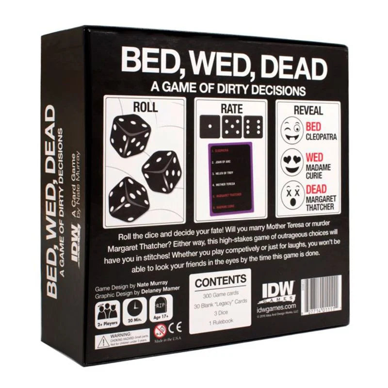 Featuring 200 cards across multiple categories with over 2,000 names—plus blank cards to personalize the game—In Bed, Wed, Dead delivers endless combinations and raucous laughter every time you play.
