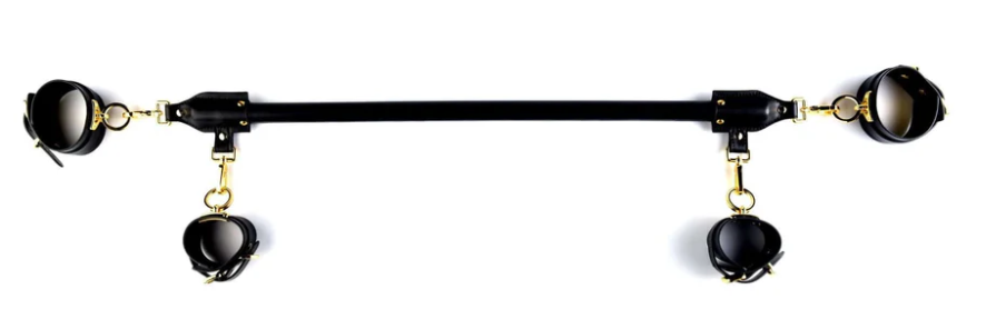 Made from luxurious Italian leather, this spreader bar will become the favorite tool in your sex toy arsenal! The whole product is wrapped with leather. The various and weighty golden accessories dangling at both ends further the beauty and uniqueness. Snap hooks fixed at the ends with dense stitches, the spreader bar can be used together with the handcuffs and ankle cuffs for binding.