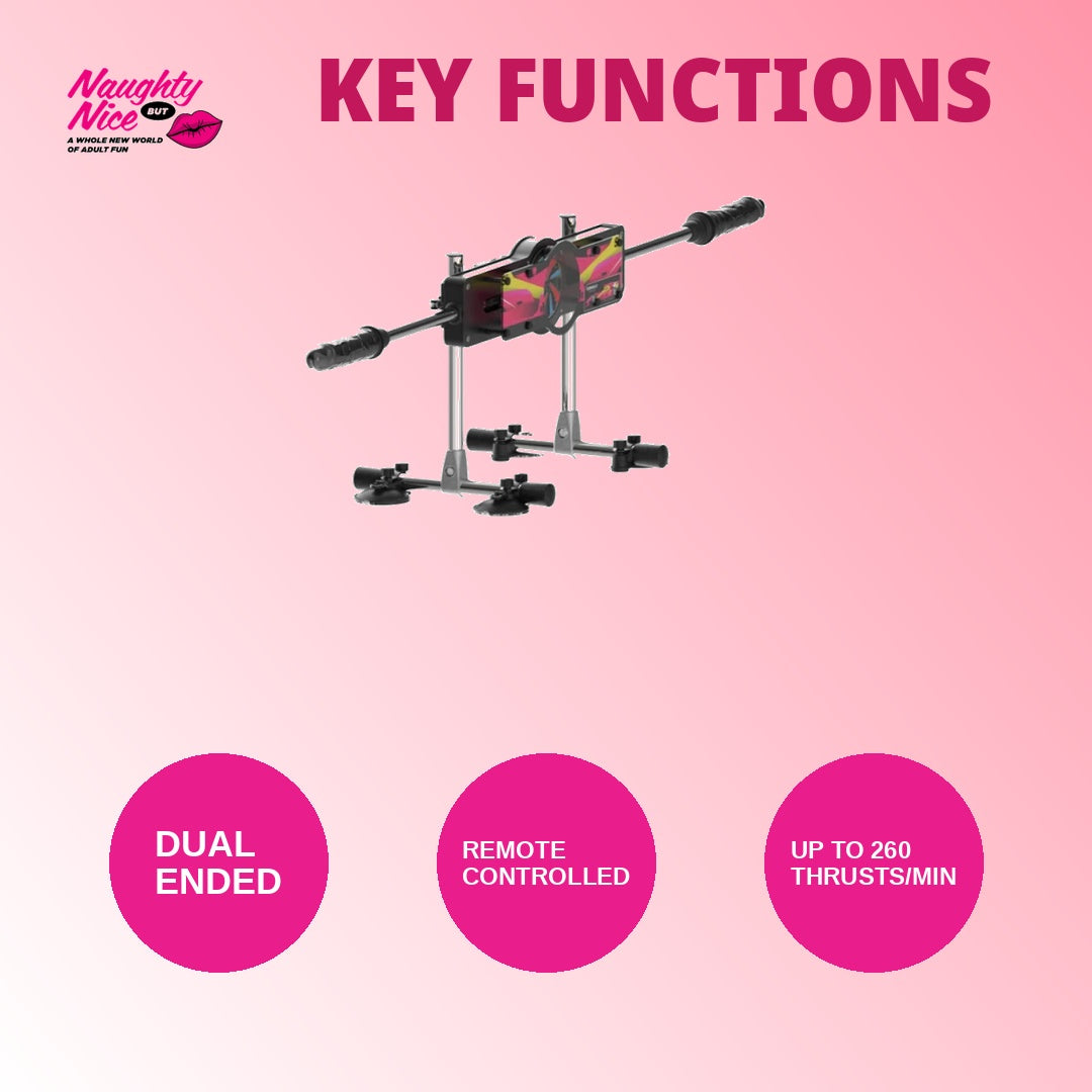 Designed for two, this dual-ended auto thrusting machine puts pleasure in both your hands—literally. Switch between gentle waves and powerful rhythms with multiple vibration settings, while the wireless remote lets you take turns commanding the action. The innovative double-end design adapts to any position you choose, whether you're facing off or exploring new angles together. Automatic thrusting combined with customizable vibrations means hands-free bliss, while the remote control adds an element of playful surprise. Built tough for couples who want versatility without compromise—seamless, synchronized, and endlessly fun.
