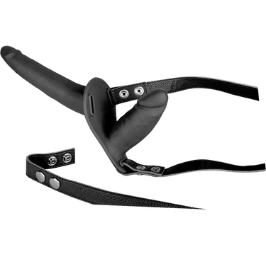 This comfortable silicone strap-on provides insertion stimulation for both parties with a smaller vaginal plug dong on the inside for the giver and the larger external dong for the receiver. With a stylish and comfy dome-snap adjustable faux-leather strap and silicone dong.
