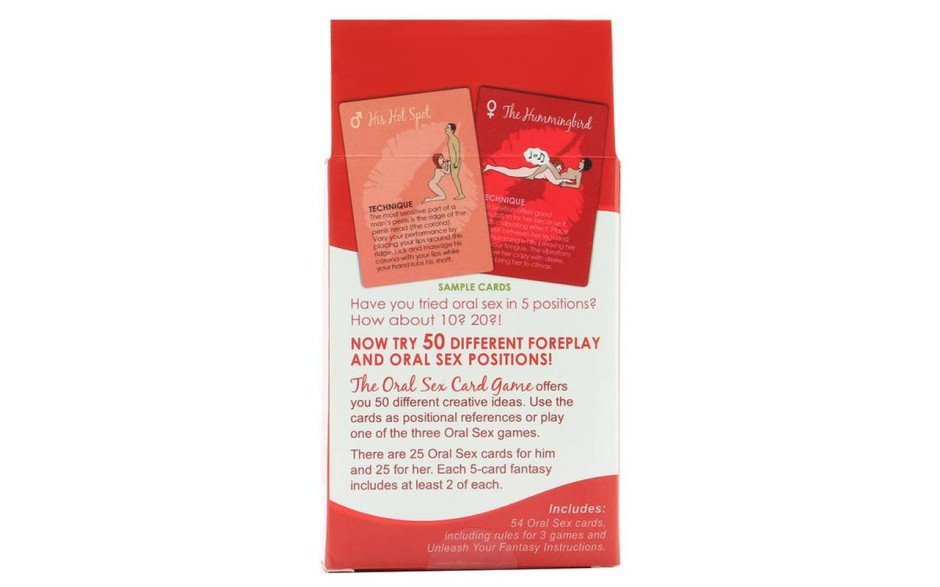 Are you ready to take your oral sex game to the next level? Introducing the Oral Sex Card Game by Kheper Games! This game will unlock 50 different foreplay and oral sex positions for you and your partner to explore. It features 25 cards for him and 25 cards for her, each with 5 positions for you to enjoy. You can use the cards as positional references or play one of the three oral sex games included. The possibilities are endless with the Oral Sex Card Game!