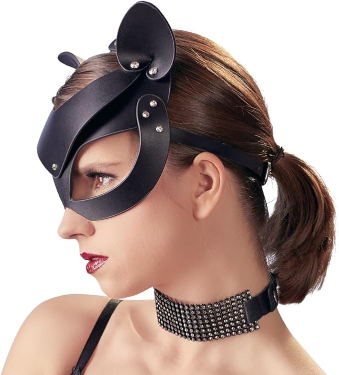 Unleash your wild side with the Bad Kitty Cat Mask, a provocative and dimensionally stable headpiece crafted from high-quality imitation leather. Designed with alluring cat ears and adorned with sparkling rhinestone rivets, this mask adds a touch of elegance to your adventurous side.