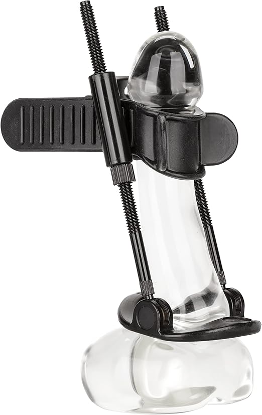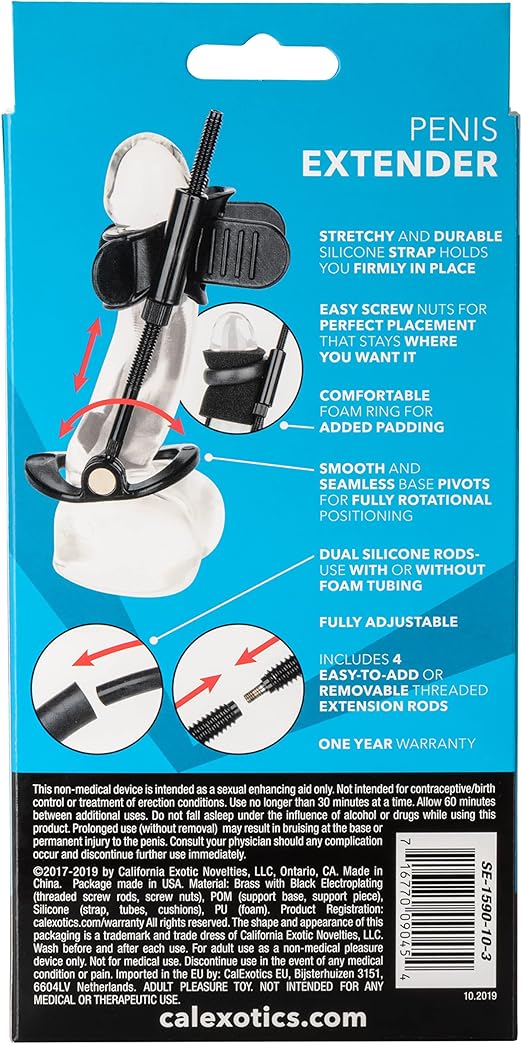 Upgrade your love unit with the Penis Extender, a professional grade lengthening system and male sex toy. The fully adjustable enhancer system has a thick, stretchy silicone strap and easy-screw nuts for perfect placement every time, while the 4 easy-to-use removable extender rods gradually increase penis length over time. The smooth, seamless base pivots to allow the penis extender to fully rotate position for comfortable extended wear. For added comfort, the included dual silicone rods can be used with or without the added foam padding.
