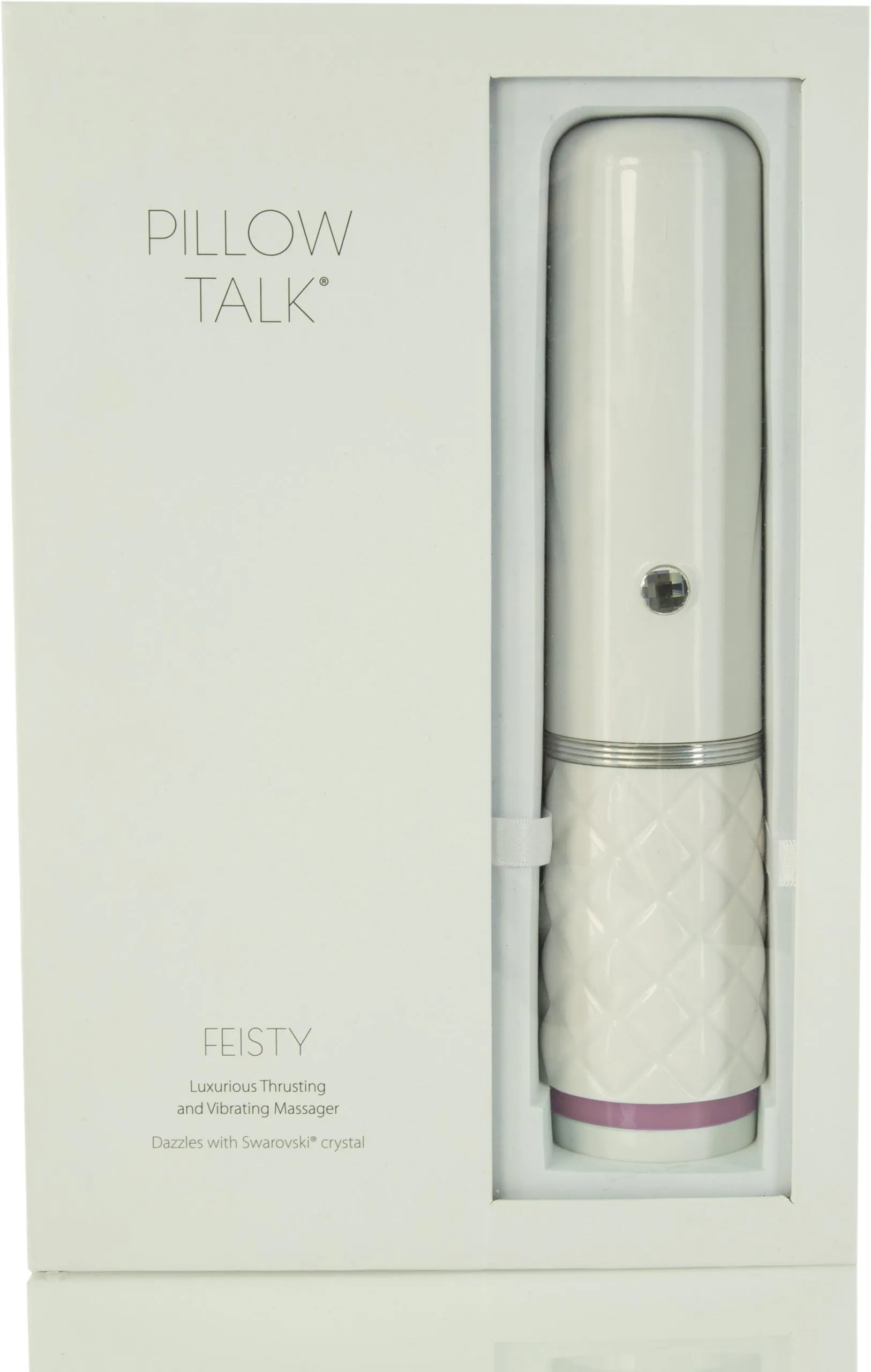 Meet Feisty, Pillow Talk’s unstoppable thrusting vibrator ready to ignite your senses! Designed for those craving something truly special, Feisty offers 2 speeds and 3 thrilling vibration and thrust patterns for endless excitement. Crafted from soft, body-safe silicone, it’s gentle on your most sensitive spots. The chic diamond-patterned handle ensures a secure grip and easy control. Plus, a removable cap adorned with a sparkling Swarovski crystal keeps it discreet and travel friendly. Attach it to the adjustable suction cup stand, and you've got a portable pleasure powerhouse wherever you go!