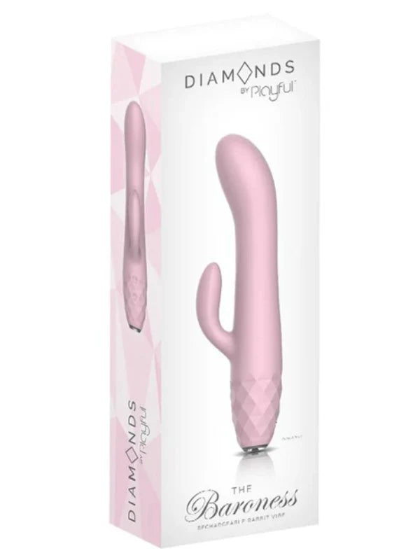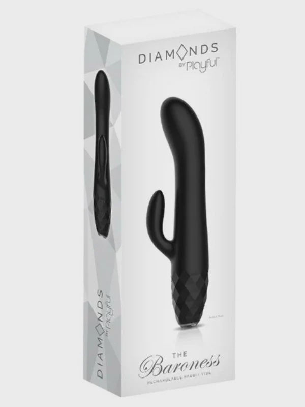 Experience the ultimate in dual pleasure with The Baroness, a beautifully designed rabbit vibrator that delivers simultaneous sensations. The firm, sculpted shaft with its curved tip reaches deep inside while the flexible rabbit arm caresses externally, creating exquisite, blended stimulation. Eight vibration intensities let you find your perfect rhythm, controlled effortlessly with intuitive dual buttons. Finished with a luxe diamond-textured grip and rechargeable for endless fun, this elegant toy brings sophistication and satisfaction to every adventure—whether you're exploring for the first time or perfecting your pleasure.