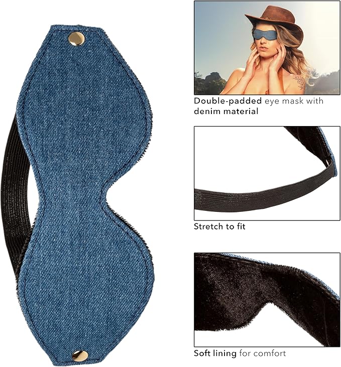 Discover the Ride 'Em™ Premium Denim Collection Eye Mask, crafted to elevate your sensory adventures with a playful edge. This eye mask boasts a double-padded design for unbeatable comfort and total light blockage, perfect for sensory deprivation fun. Made from soft, stretchy denim, it hugs every head size snugly for a custom fit. Whether you’re delving into bondage, role play, or spicing up intimate moments, its chic denim look adds a dash of style and excitement. Embrace the thrill of heightened senses and let your imagination take the lead with this irresistible accessory.