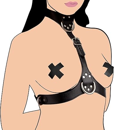 This elegant chest harness features three adjustable buckles that provide a refined, customizable fit across a variety of feminine body shapes. Crafted from a durable, leather-like material and accented with polished chrome hardware, it offers a striking presence ideal for consensual BDSM play. Two generously sized D-rings—positioned at the neck and sternum—serve as secure attachment points for accessories such as wrist cuffs, leashes, chains, or rope. Whether worn by you or your consensual partner, this versatile harness delivers both beauty and functionality.